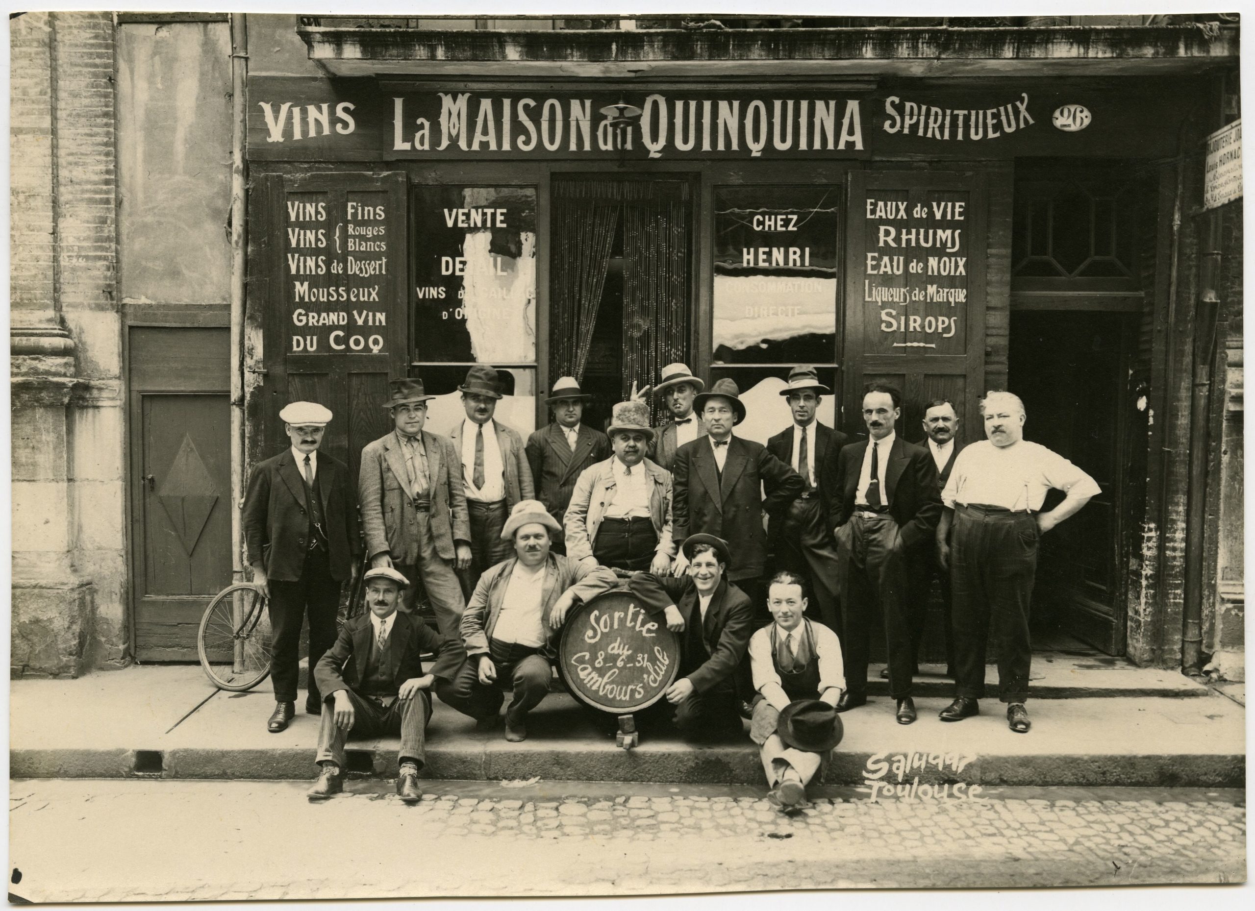 Maison du quinquina, débit de boisson et vente en gros, 26 rue Peyras. 8 juin 1931. Photographie de groupe des membres du Cambours’ Club posant dans la rue devant la vitrine du magasin à l’occasion d’une sortie. Ville de Toulouse – Archives municipales. 1Fi1735. La Dépêche 20 mars 1938. Photographies personnelles.