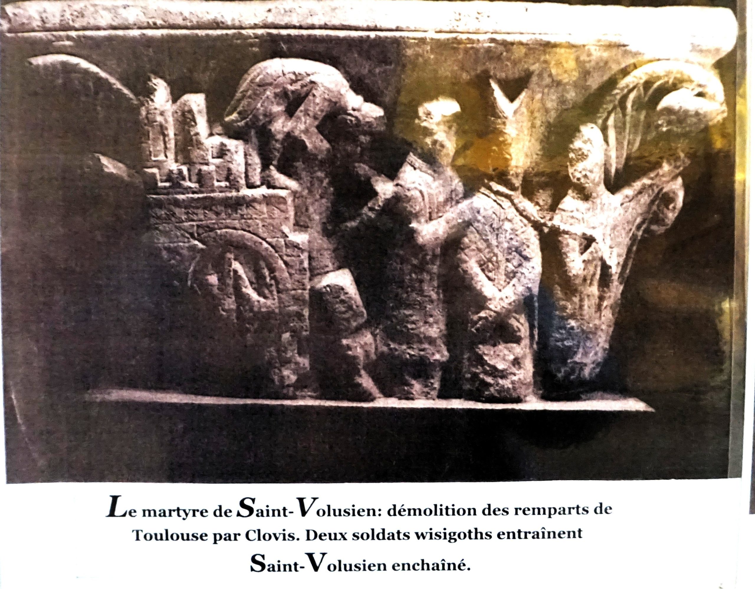 Un chapiteau illustre la démolition des remparts de Toulouse par Clovis : deux soldats wisigoths entraînent Saint-Volusien enchaîné..